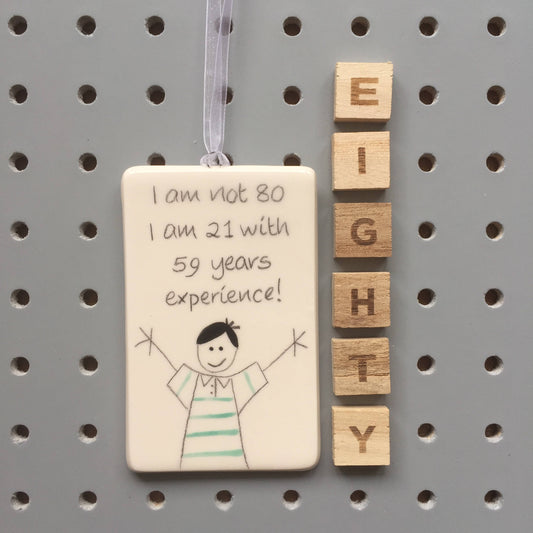 80th Birthday - I am not 80, I am 21 with 59 years experience - Hand Painted Ceramic Plaque