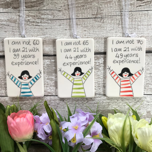 70th Birthday - I am not 70, I am 21 with 49 years experience - Female - Hand Painted Ceramic Plaque
