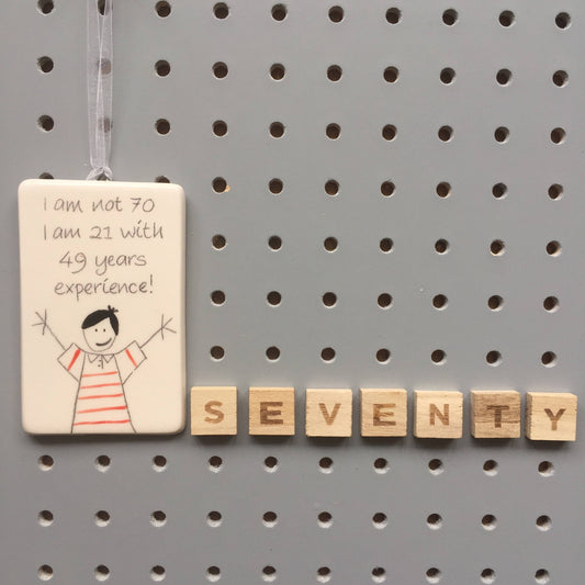 70th Birthday - I am not 70, I am 21 with 49 years experience - Hand Painted Ceramic Plaque