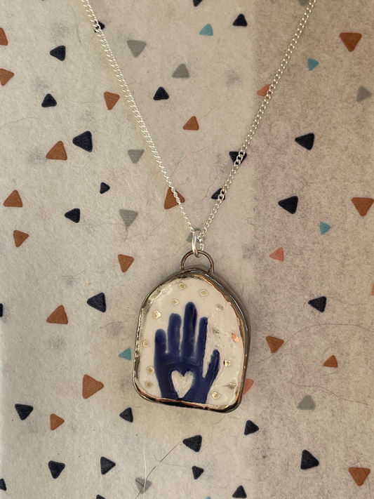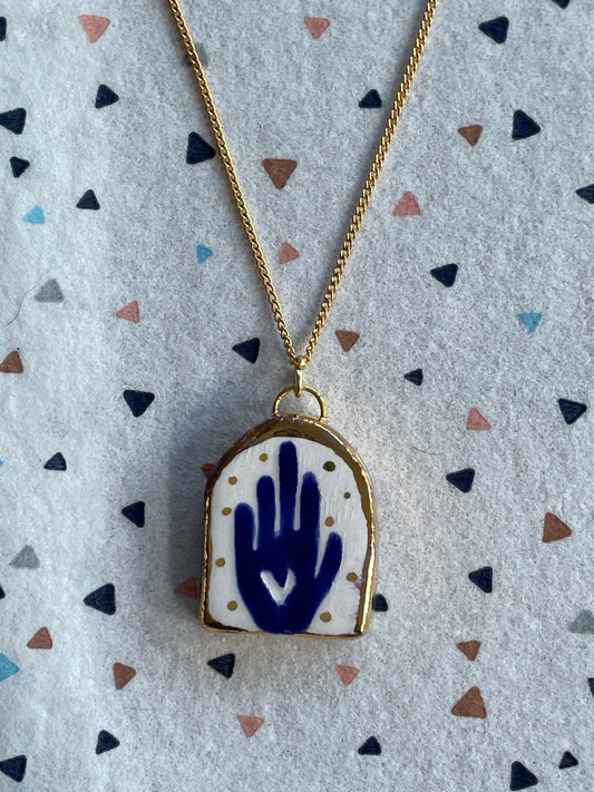 Seconds - Handmade Ceramic Charm Necklace with hand painted blue hand design
