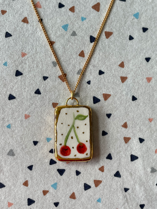Seconds - Handmade Rectangle Ceramic Charm with Hand Painted Cherry Design Necklace