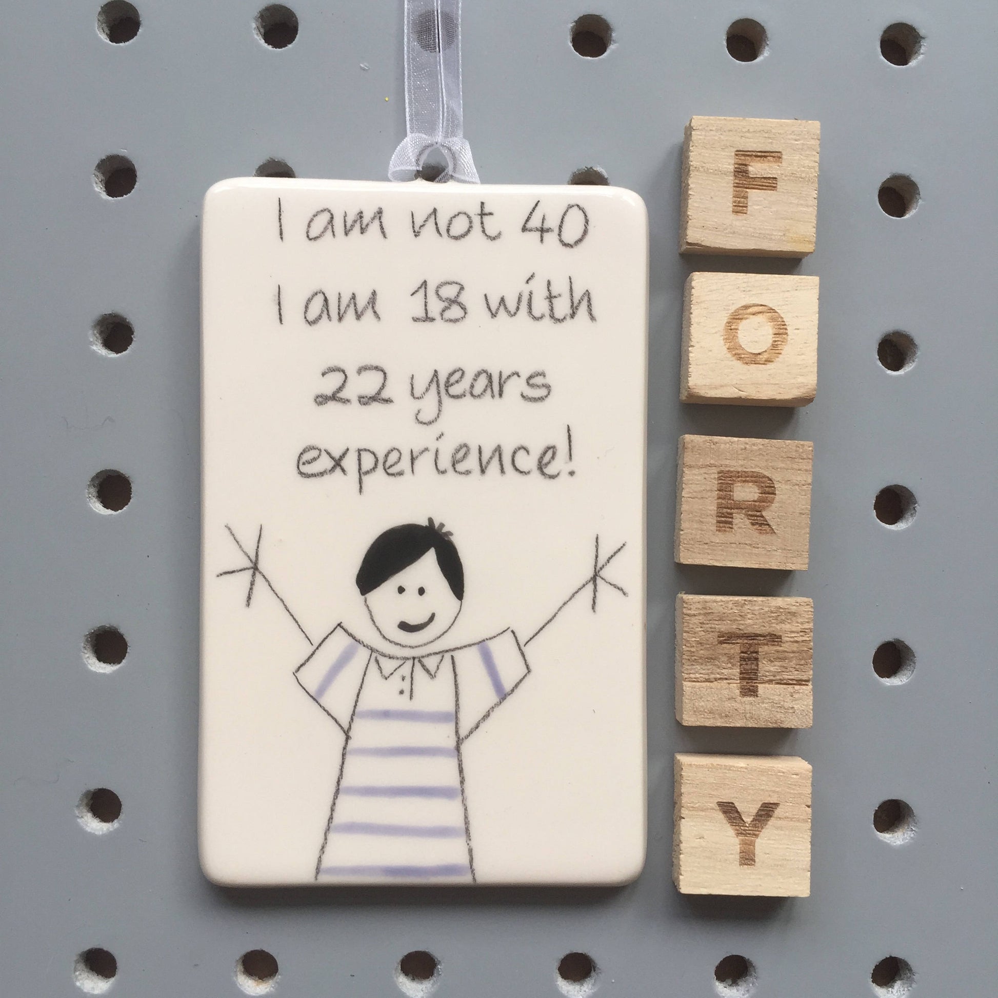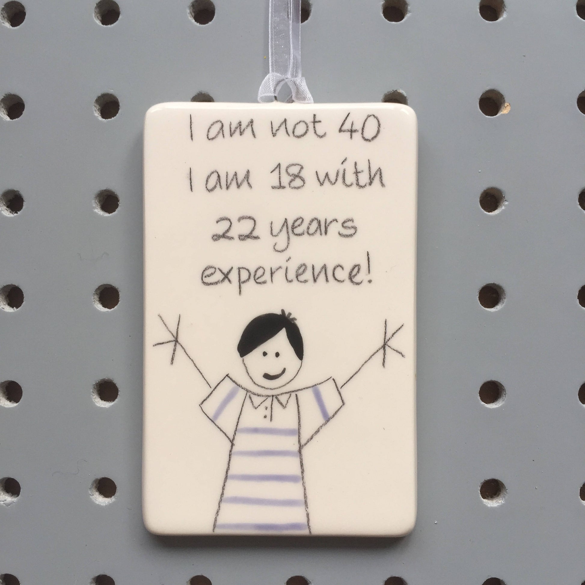 40th Birthday - I am not 40, I am 18 with 22 years experience - Hand Painted Ceramic Plaque