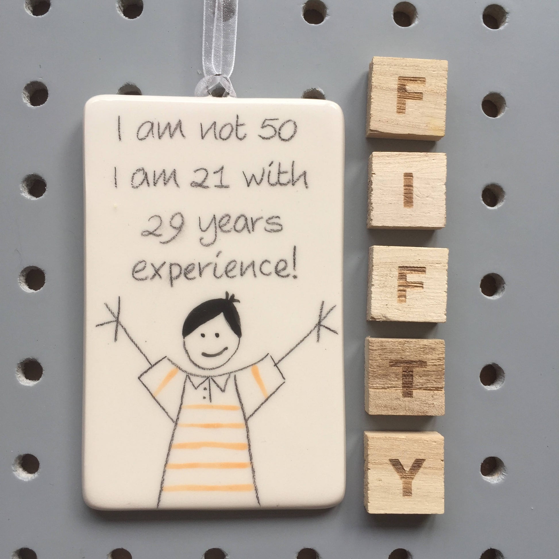 50th Birthday - I am not 50, I am 21 with 29 years experience - Hand Painted Ceramic Plaque