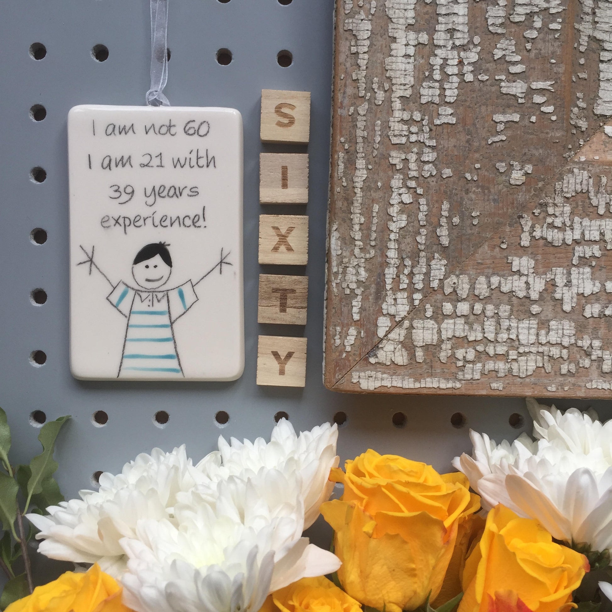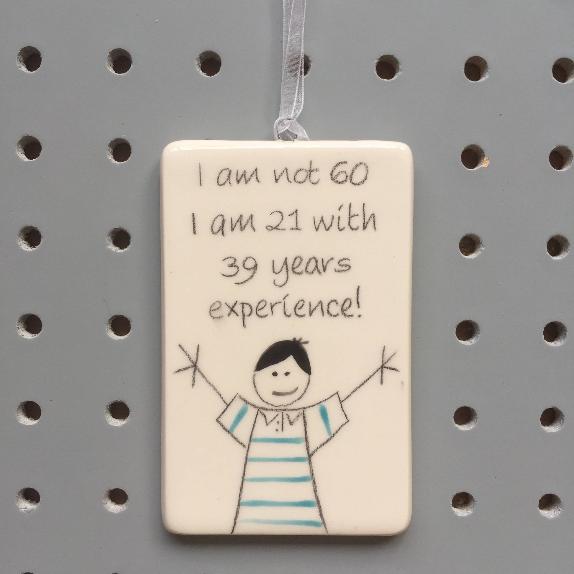 60th Birthday - I am not 60, I am 21 with 39 years experience - Hand Painted Ceramic Plaque