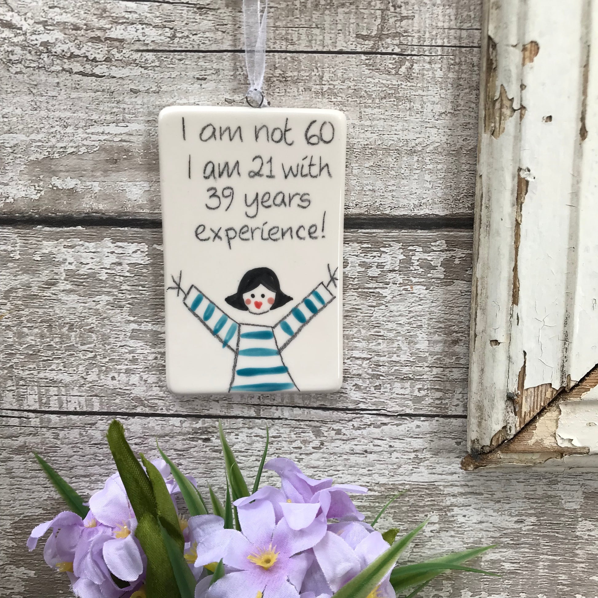 60th Birthday - I am not 60, I am 21 with 39 years experience - Female - Hand Painted Ceramic Plaque