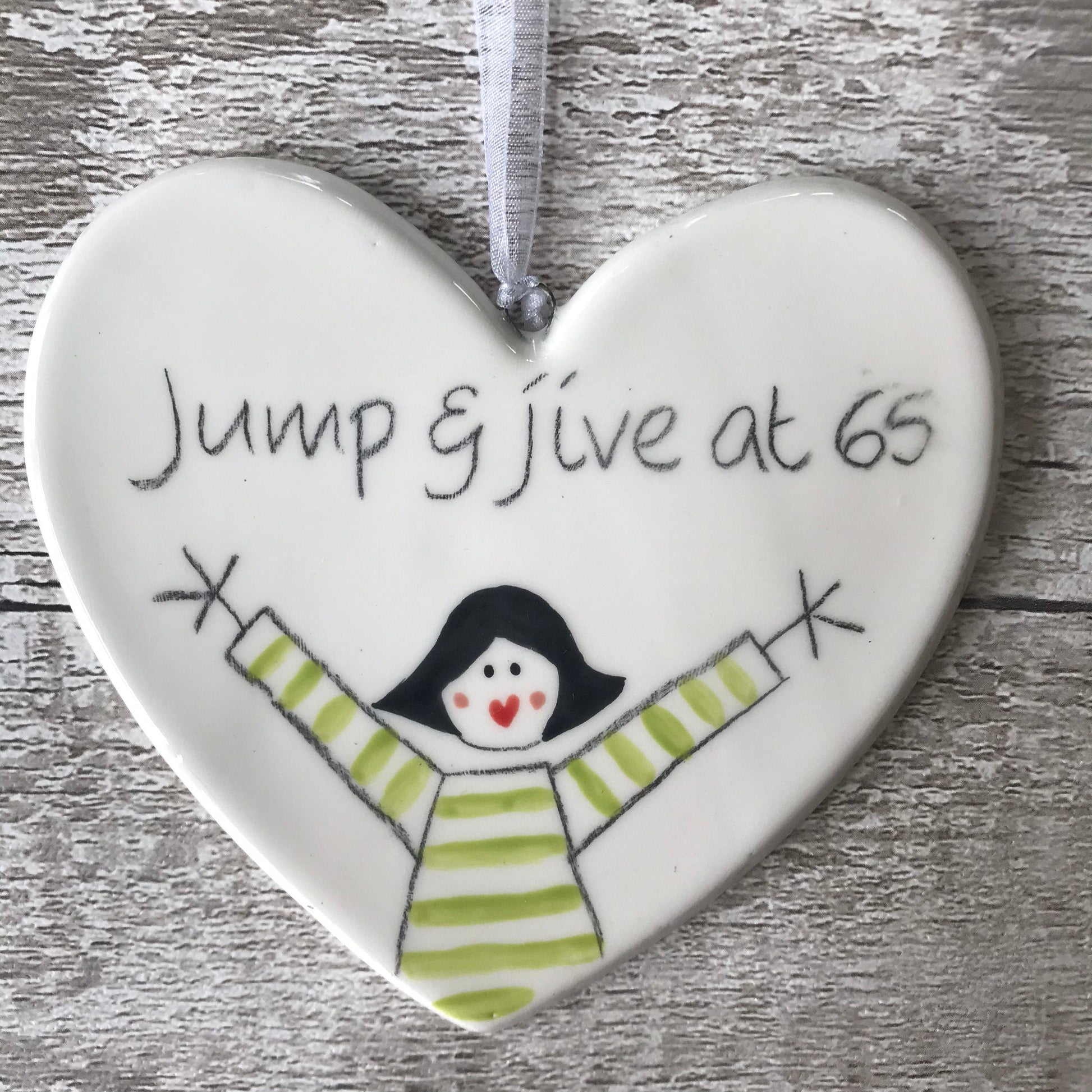 65th Birthday - Jump and jive at 65 - Hand painted Ceramic Heart