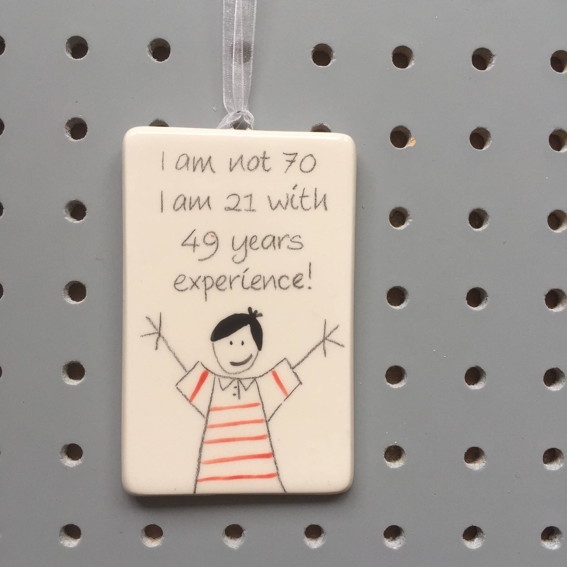 70th Birthday - I am not 70, I am 21 with 49 years experience - Hand Painted Ceramic Plaque