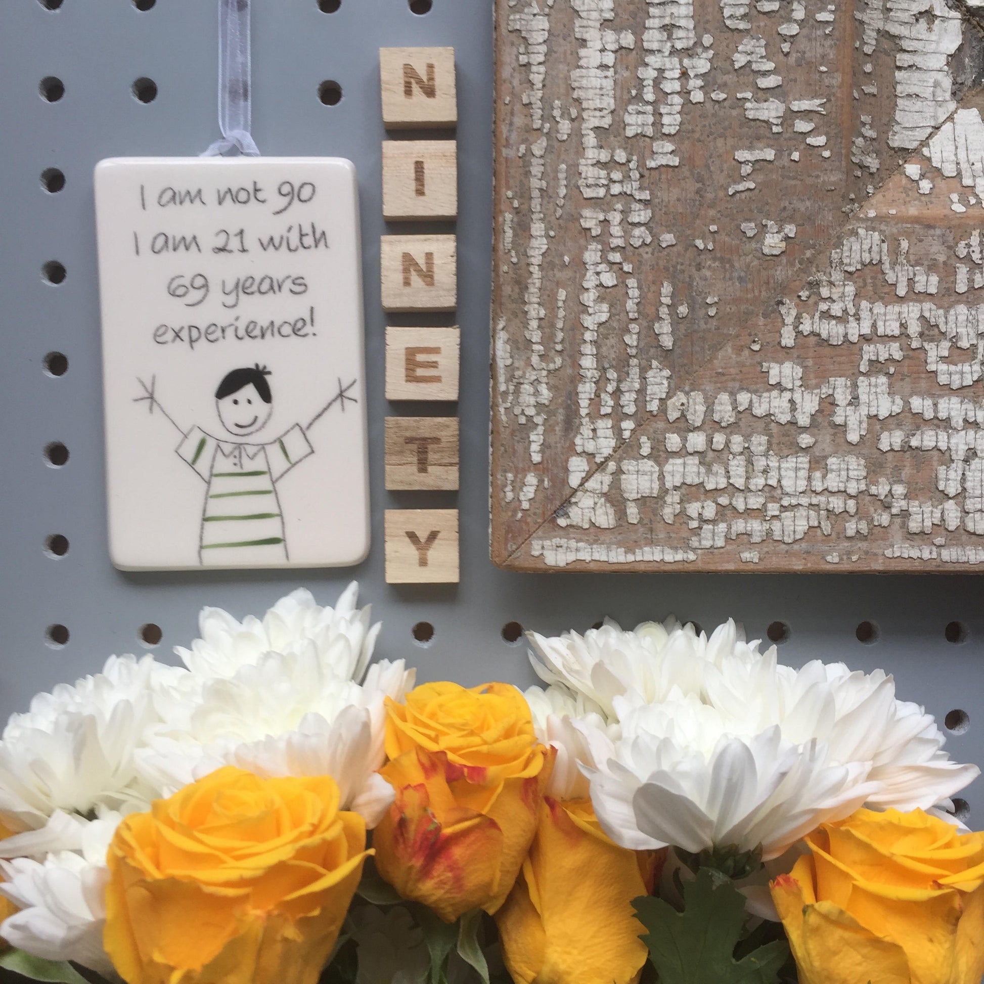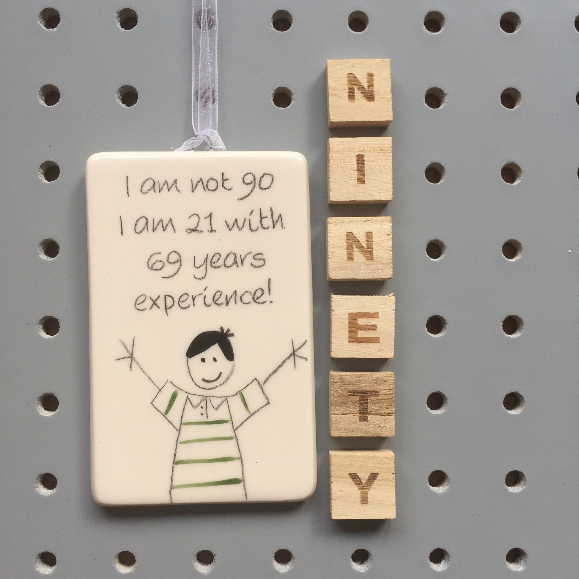 90th Birthday - I am not 90, I am 21 with 69 years experience - Hand Painted Ceramic Plaque