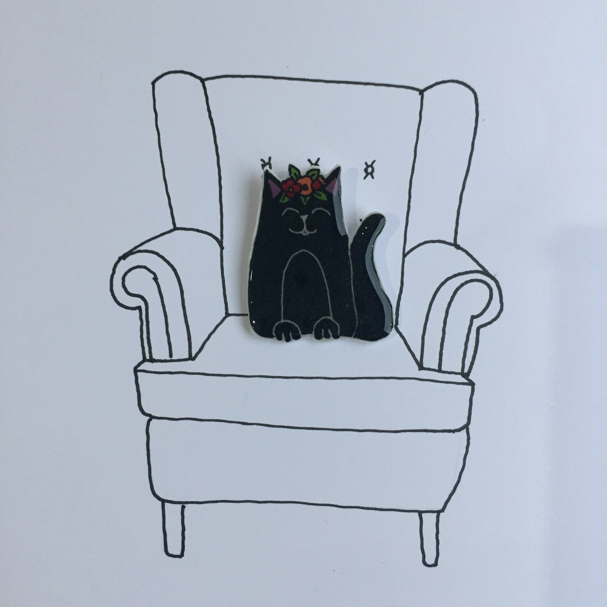This little black kitty is wearing a crown of flowers and will sit pretty on any coat or bag