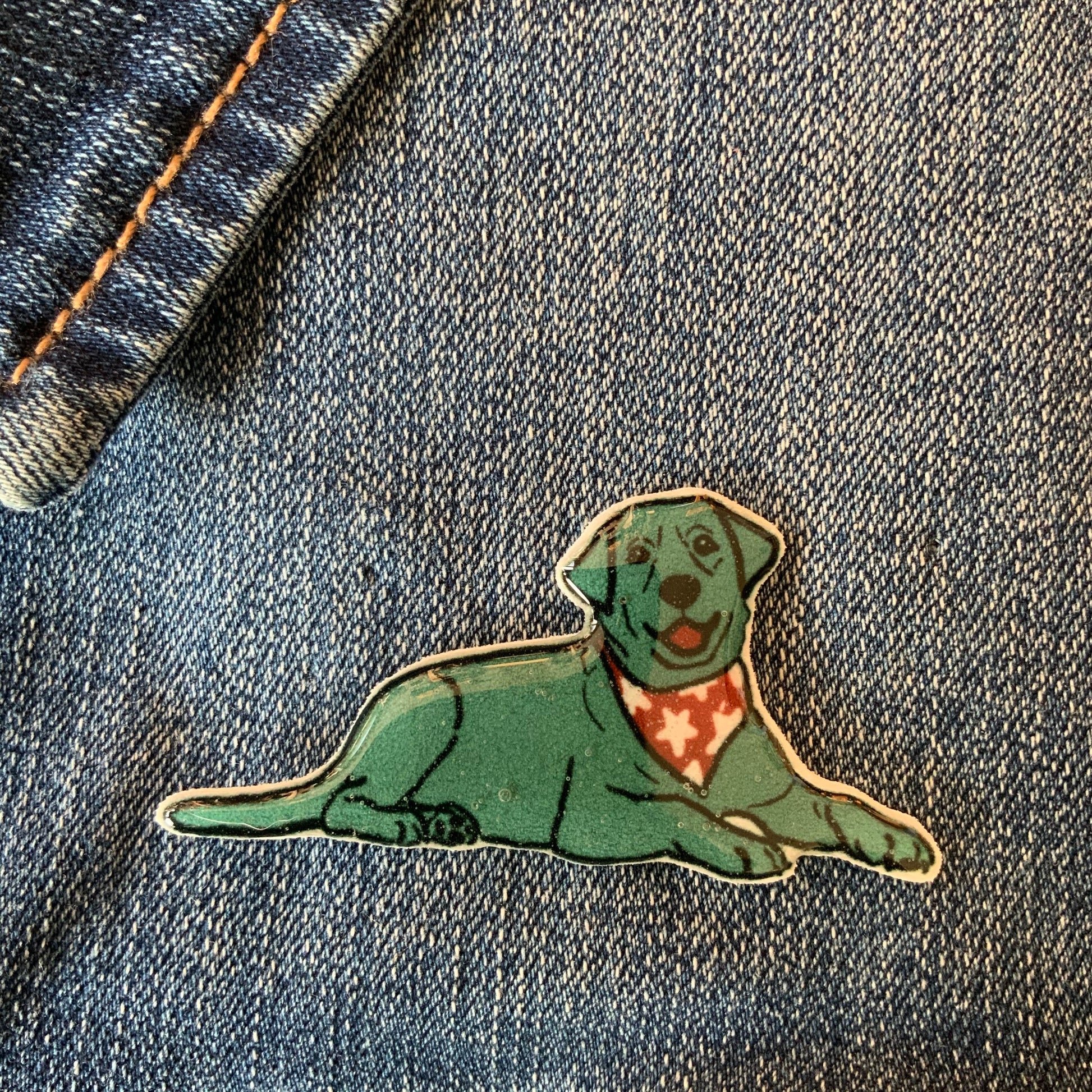 This pin is hand made from a non-toxic shrink plastic and coated in a clear resin and mounted onto a silver coloured brass butterfly clutch tie tack pin back.