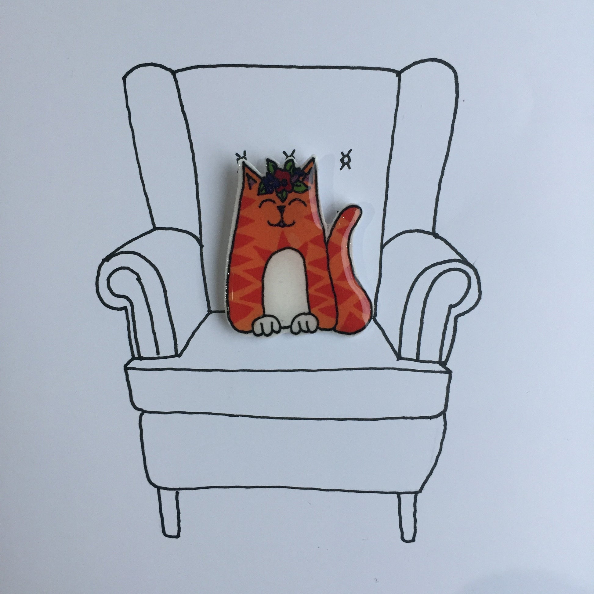 This Ginger Tom Cat is wearing a crown of flowers and will sit pretty on any coat or bag.