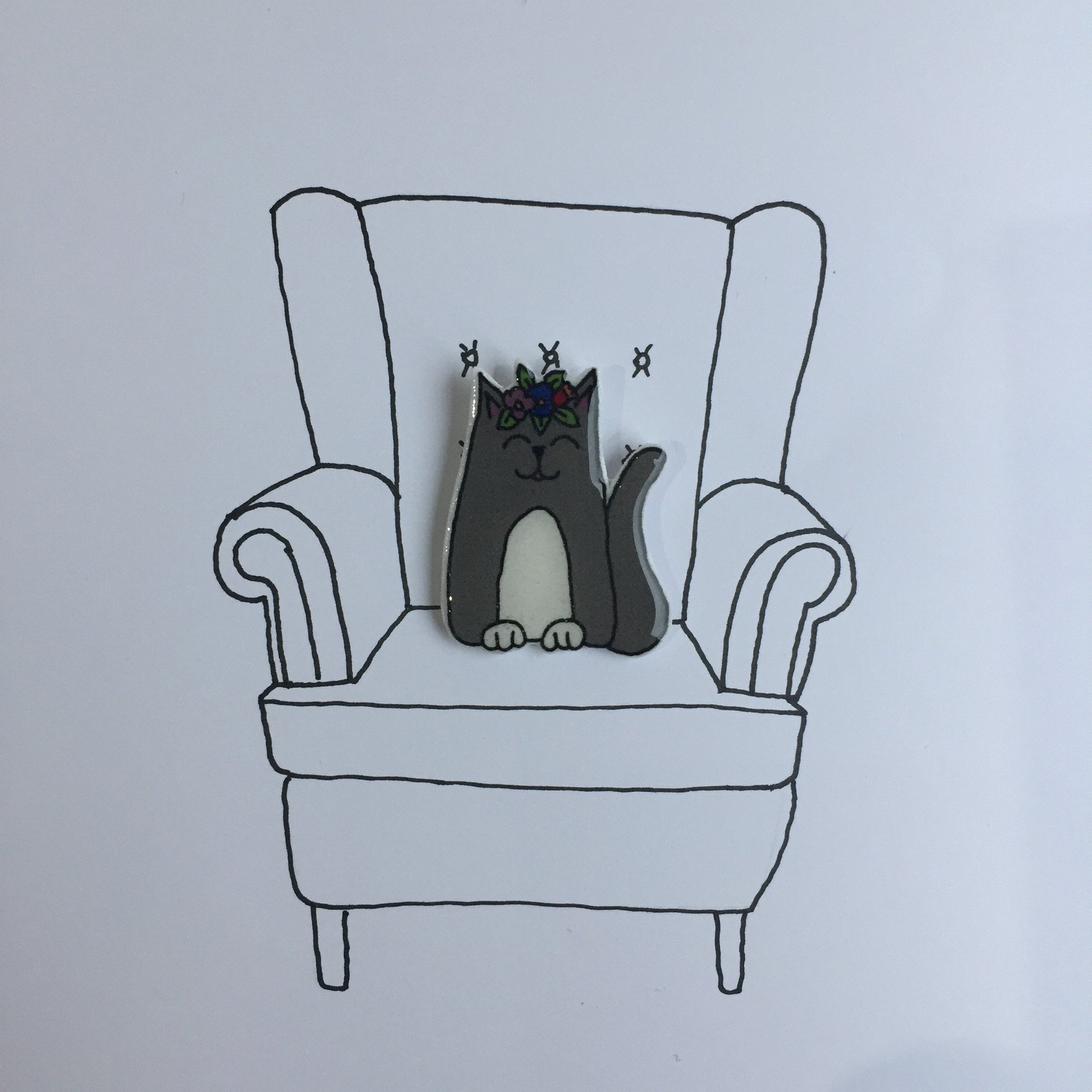This Grey & White Cat is wearing a crown of flowers and will sit pretty on any coat or bag