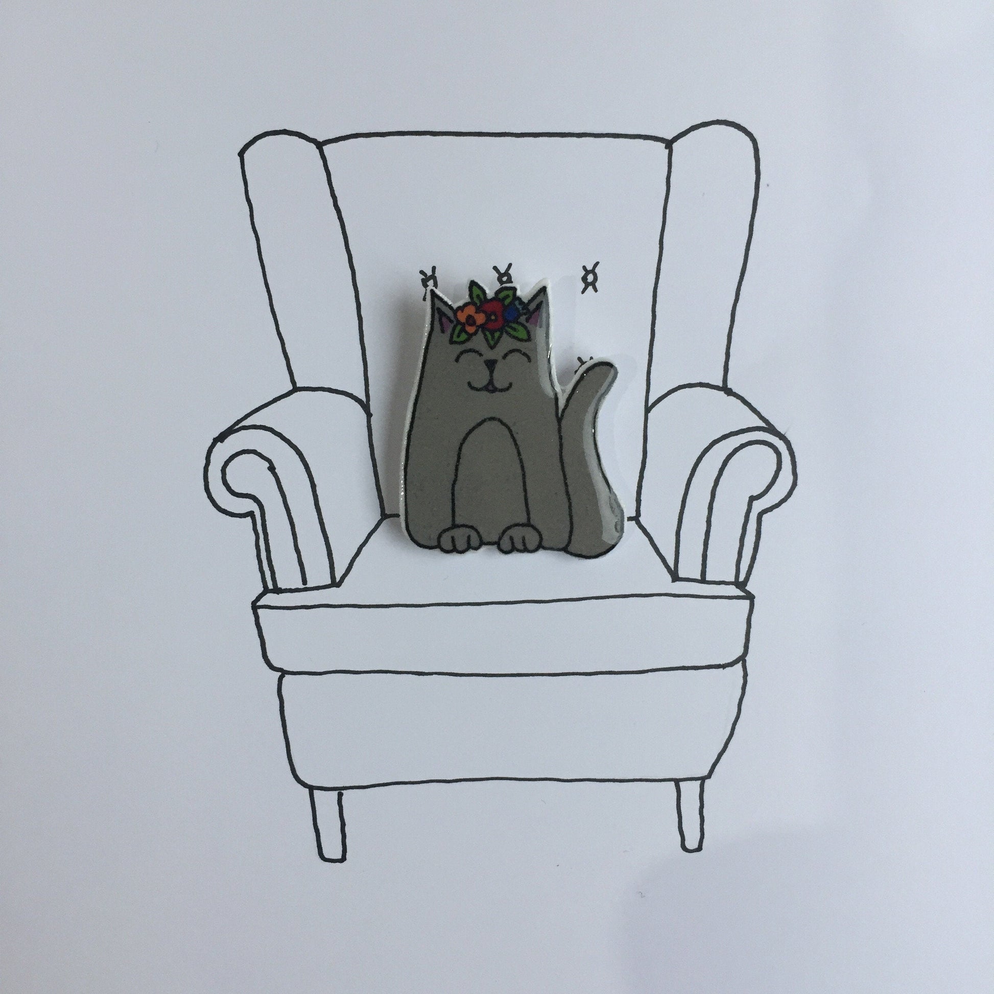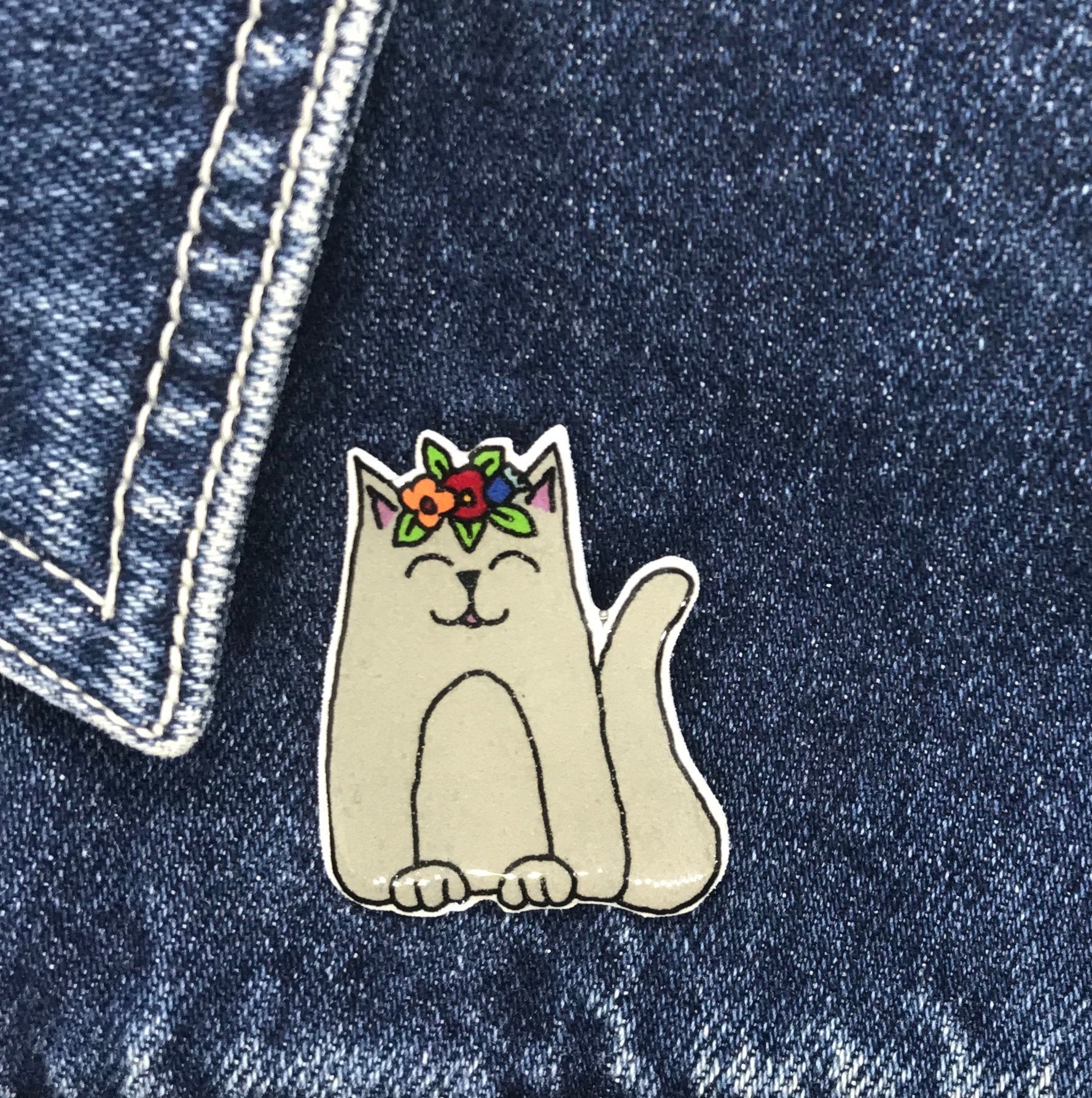 This little Grey Cat is wearing a crown of flowers and will sit pretty on any coat or bag