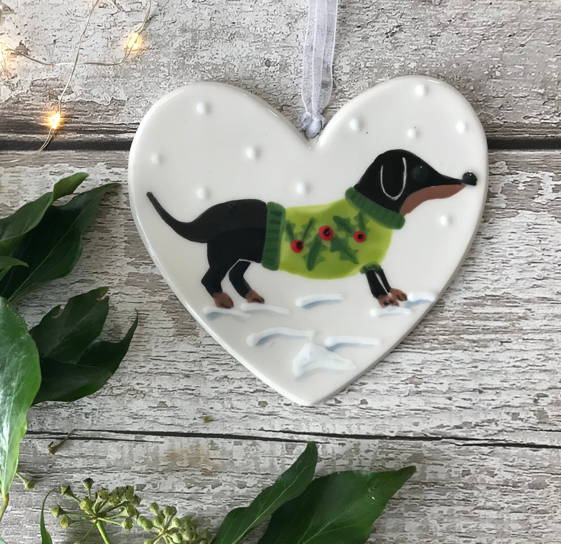 Hand painted ceramic heart featuring a Black and Tan Sausage Dog/Dachshund wearing a festive jumper and sitting in the snow