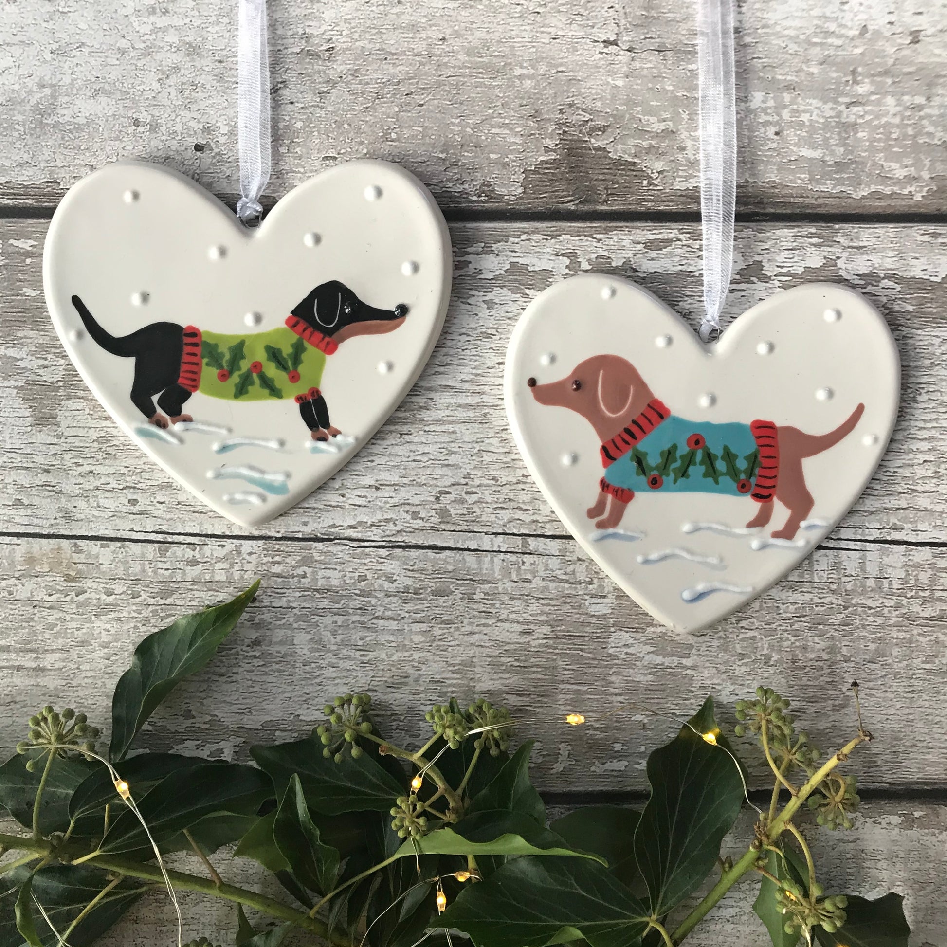 Hand Painted Ceramic Heart Christmas Decoration - Tan Sausage Dog/Dachshund wearing a festive jumper sitting in the snow