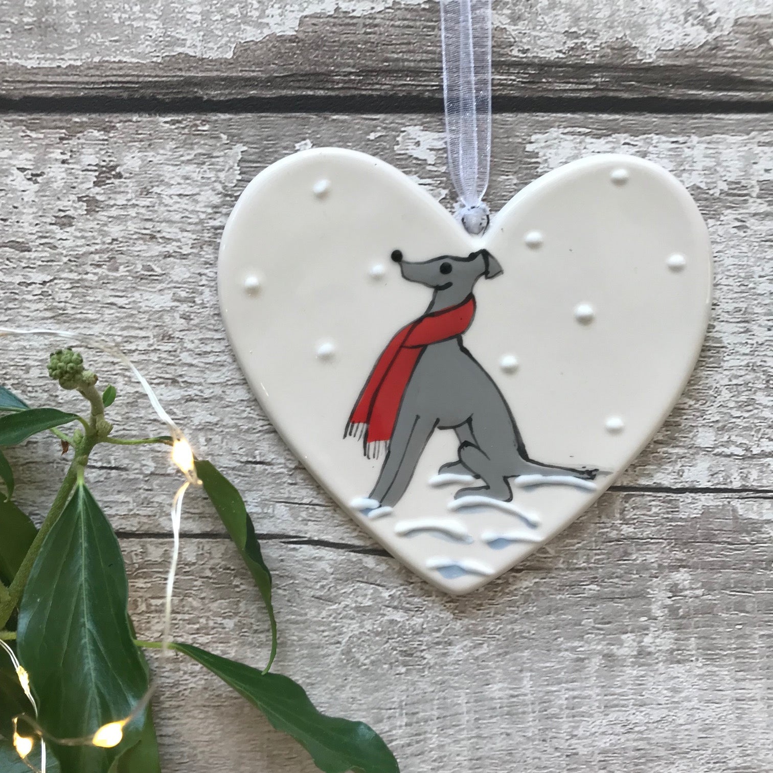 Celebrate your love of Whippets and Greyhounds with this beautifully hand painted ceramic heart decoration, featuring a graceful greyhound-type dog wrapped in a cosy red scarf and sitting in the snow.
