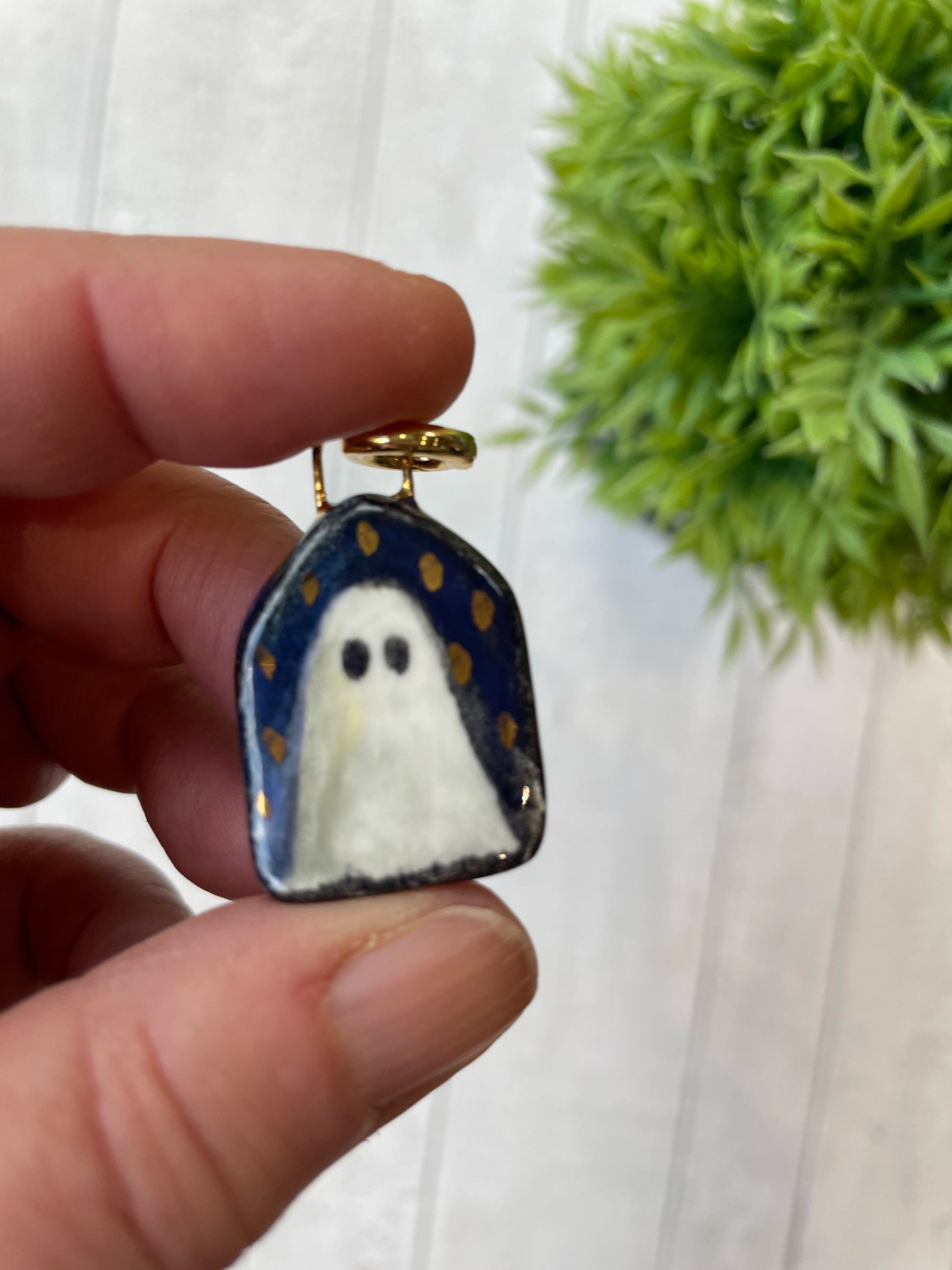 This tiny ceramic treasure has a soft, friendly ghost on the front, framed by a deep navy arch and glimmering gold dots that give it a magical, starry-night feel.