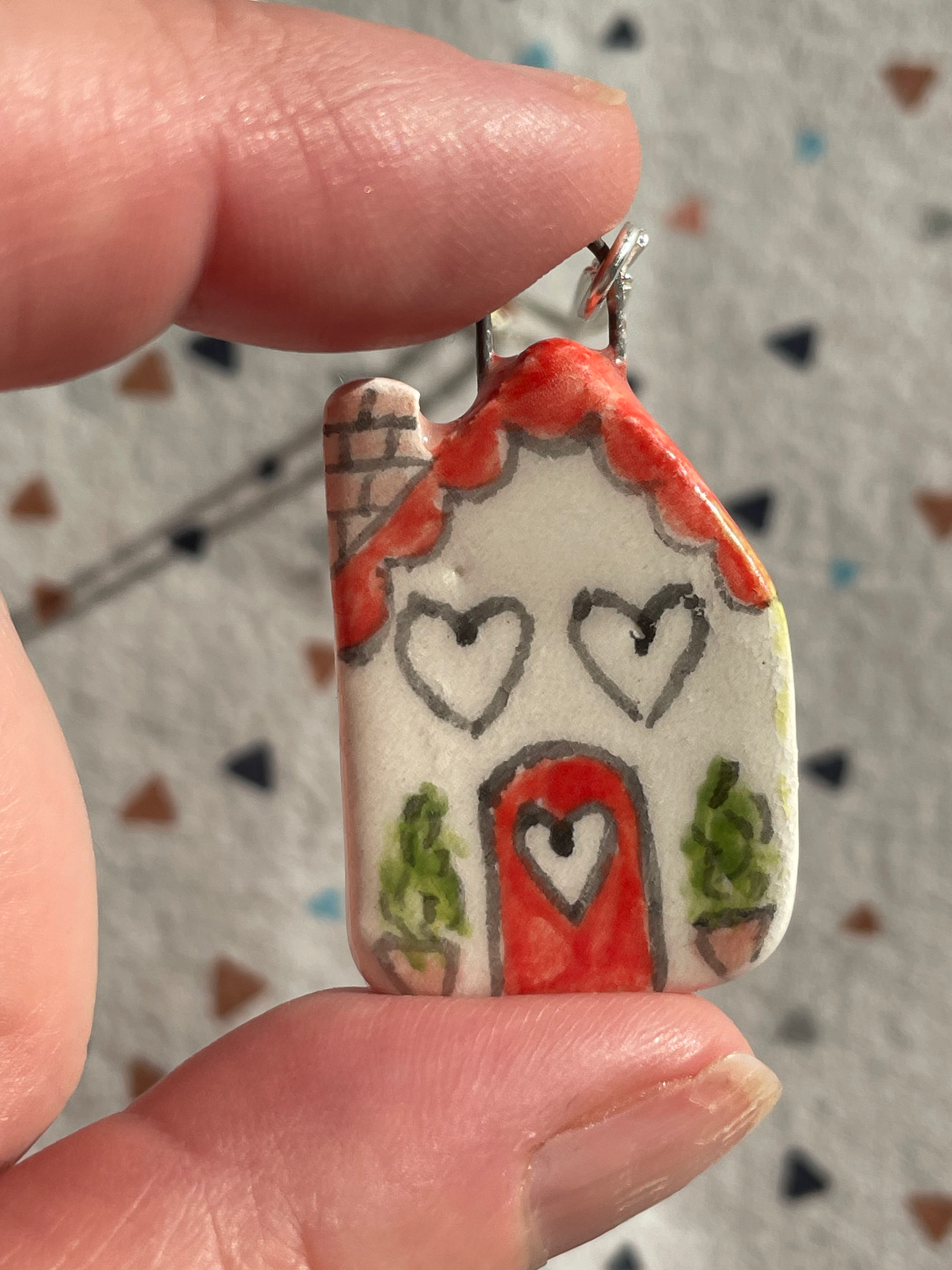 This Red Door House ceramic charm Is very cute as is taken from one of my most popular illustrations. Handmade into the shape of a small house and hand painted with a red roof and red door, heart windows, brick chimney and potted plants all illustrated using a teeny tiny paintbrush. Illustrated the same on both sides.