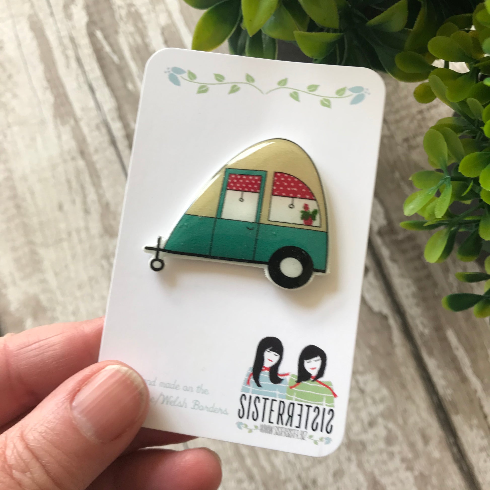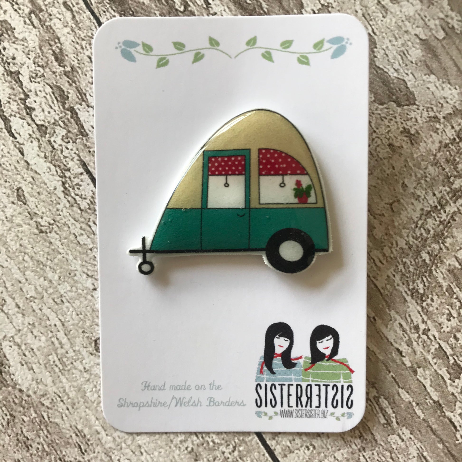 This caravan design is based on some of the Vintage Caravan designs. With it's teal, fawn & raspberry colourway, makes a lovely little pin for any Caravan Enthusiast. And can you spot the little potted plant in the window?