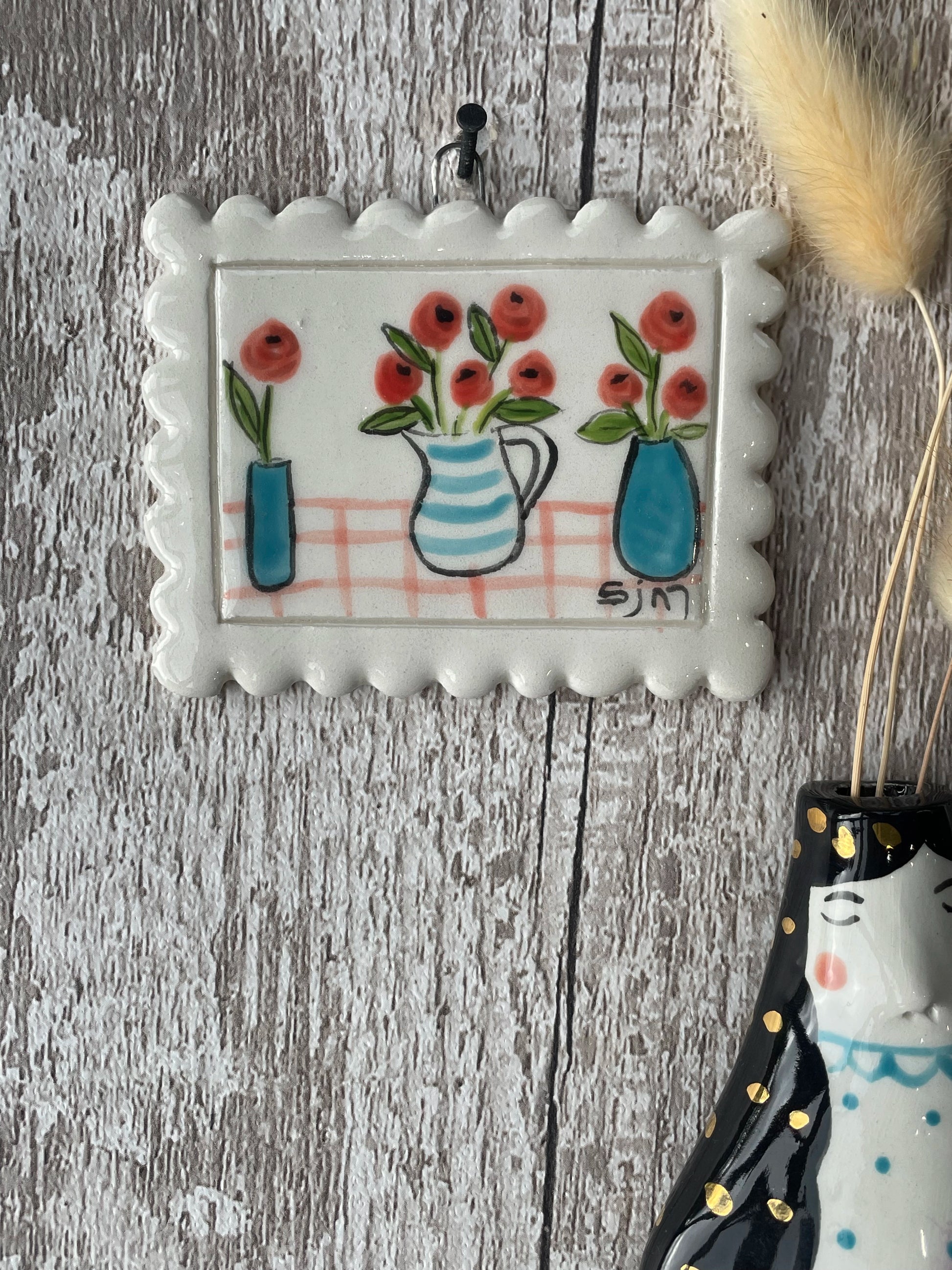 This one-of-a-kind ceramic artwork features three charming vessels: a blue striped jug and two simple vases, each holding bright red blooms with fresh green leaves. They sit on a soft pink gingham tablecloth, a gentle nod to kitchen tables and handmade comfort. The piece is framed by my signature scalloped ceramic edge and finished with a glossy glaze for a timeless yet playful feel.
