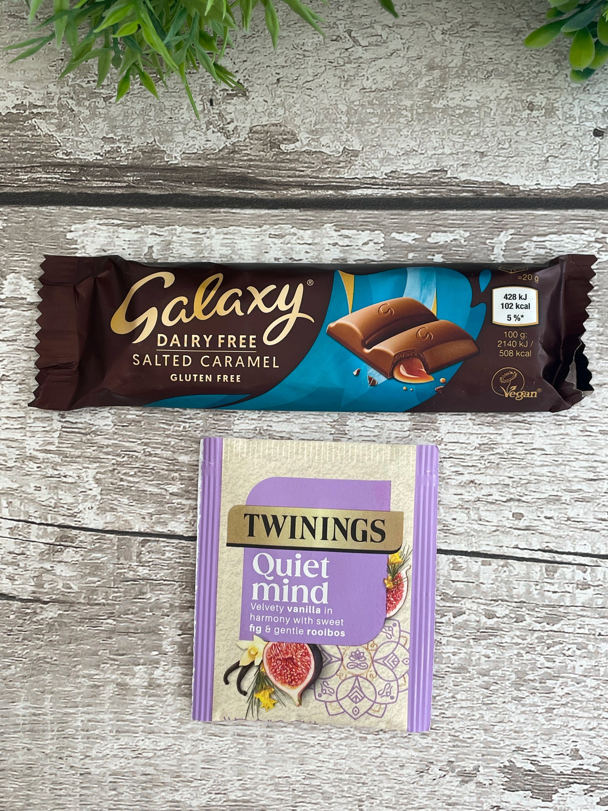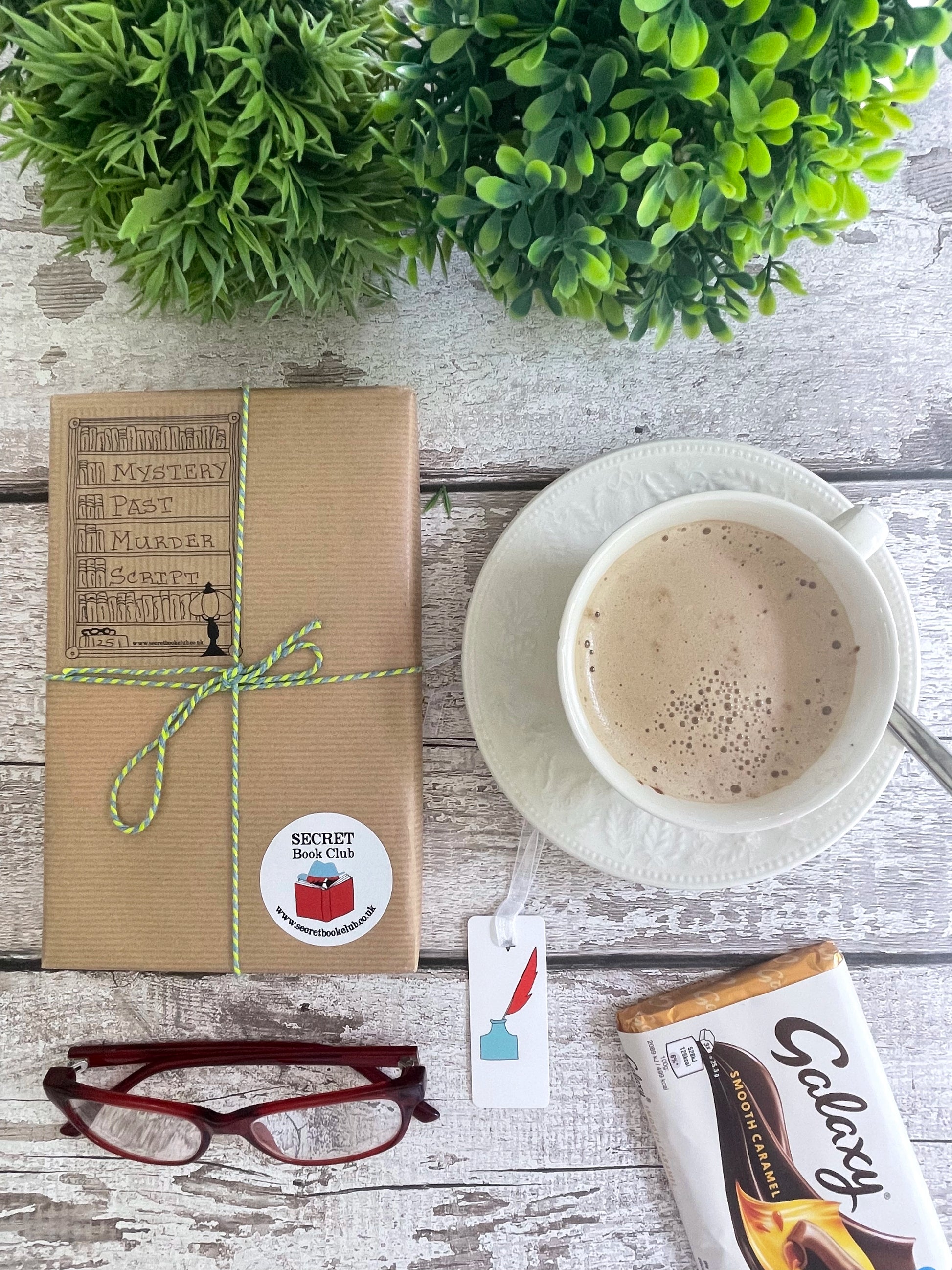 Flat lay of a Secret Book Club gift box featuring a wrapped book labeled with clue words “Mystery, Past, Murder, Script”, alongside a Galaxy caramel chocolate bar, instant coffee in a teacup, a bookmark, red reading glasses, and greenery on a rustic white wooden table.