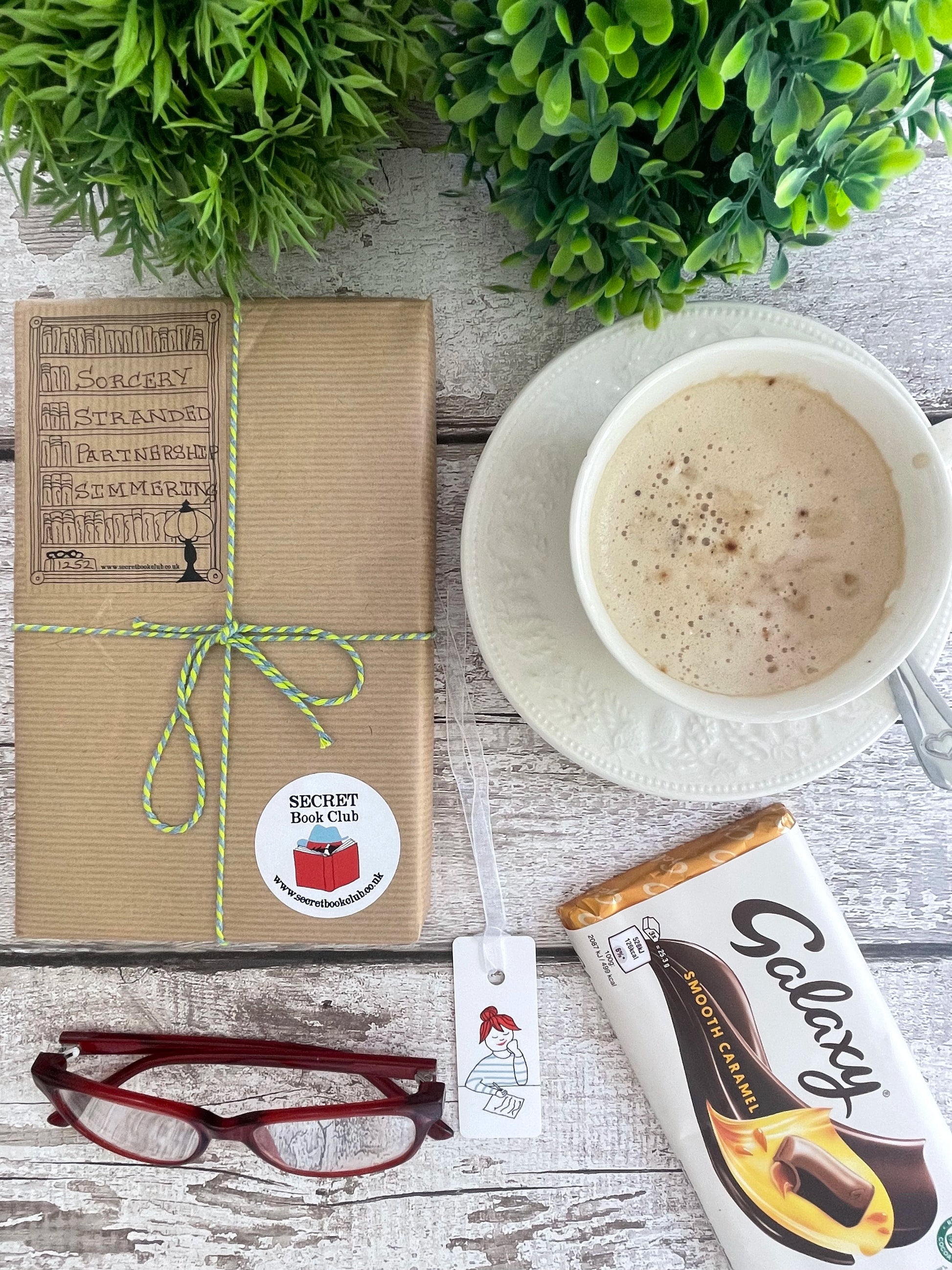Flat lay of a Secret Book Club gift box featuring a wrapped book labeled with clue words “Sorcery, Stranded, Partnership, Simmering”, alongside a Galaxy caramel chocolate bar, instant coffee in a teacup, a bookmark, red reading glasses, and greenery on a rustic white wooden table.
