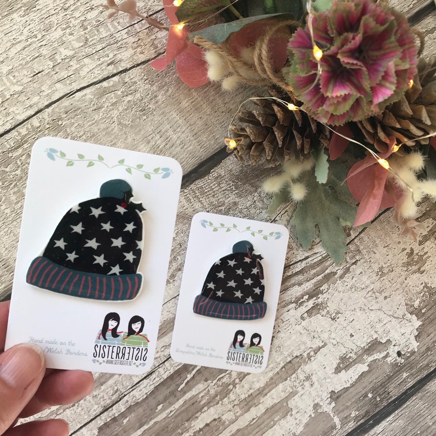 Navy Bobble Hat with Stars and Holly Handmade Pin