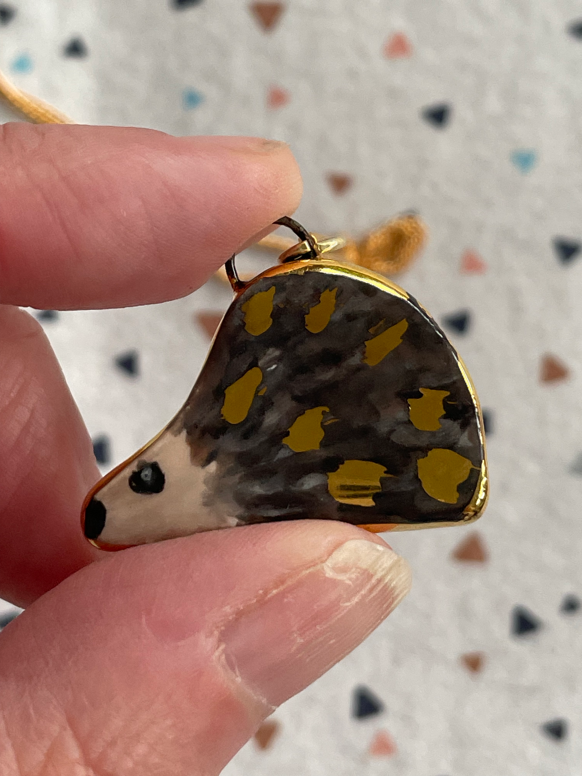 This ceramic charm of a Hedgehog is just too cut.. Hand painted on the front only, in various shades of brown and black, hand painted gold lustre brushstrokes to highlight spikes and all around the edge, that sparkle when the light hit them.