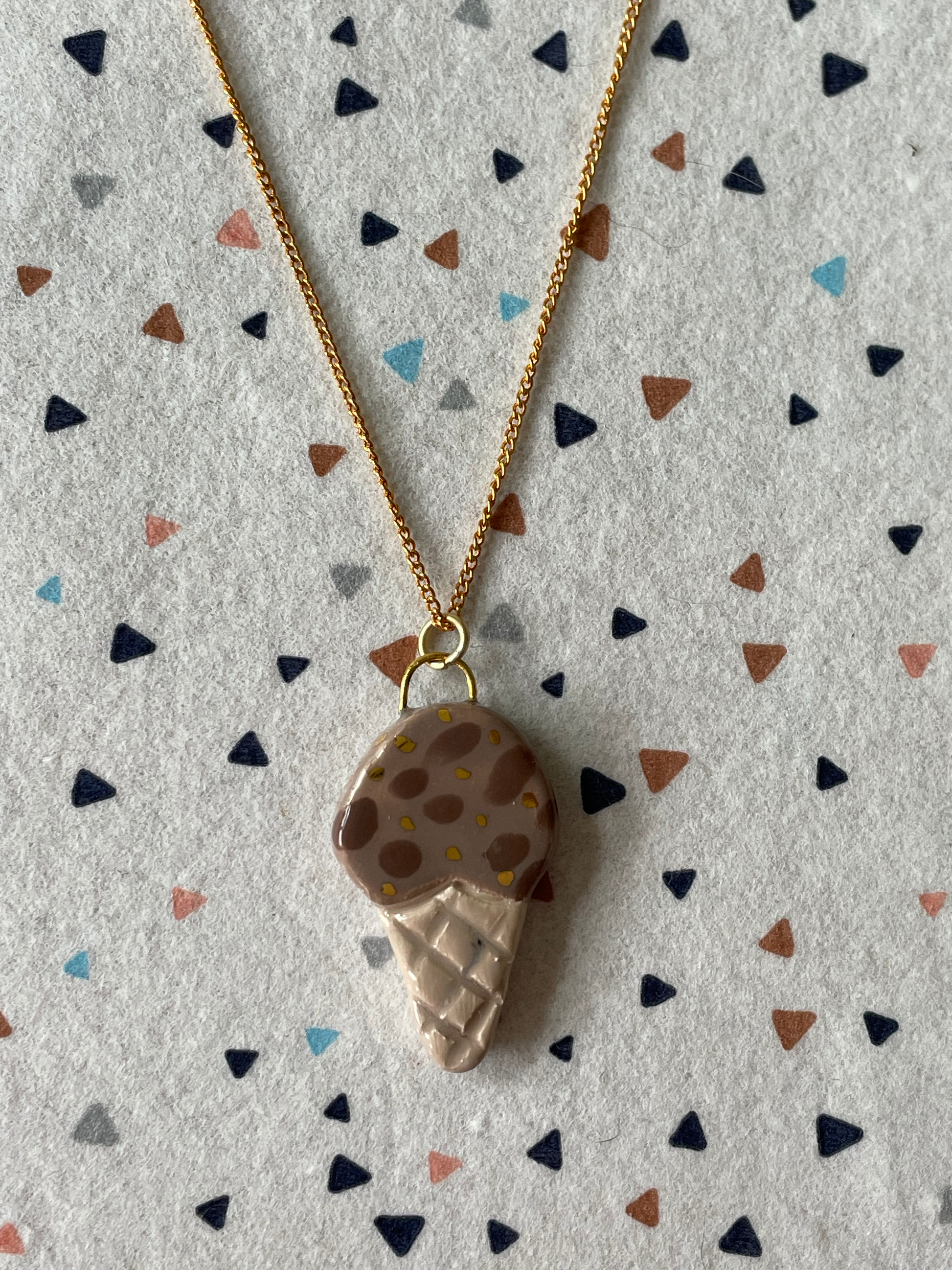 Seconds - Handmade Chocolate Chip Ice Cream Cone Ceramic Charm on a 18"/45cm Gold Plated Chain