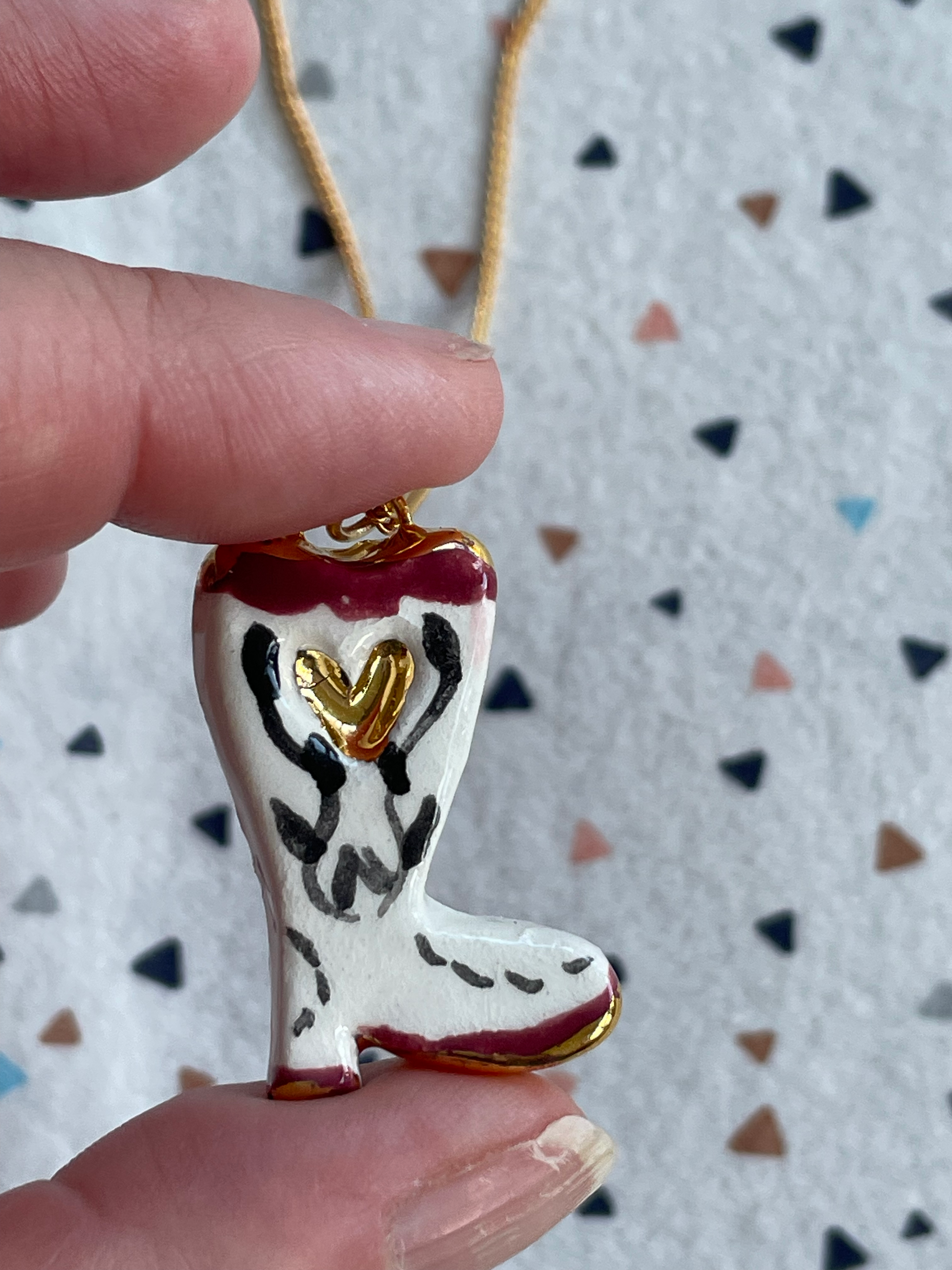 Seconds - Handmade White Cowboy Boot Ceramic Charm Necklace on a 18"/45cm Gold Plated Chain