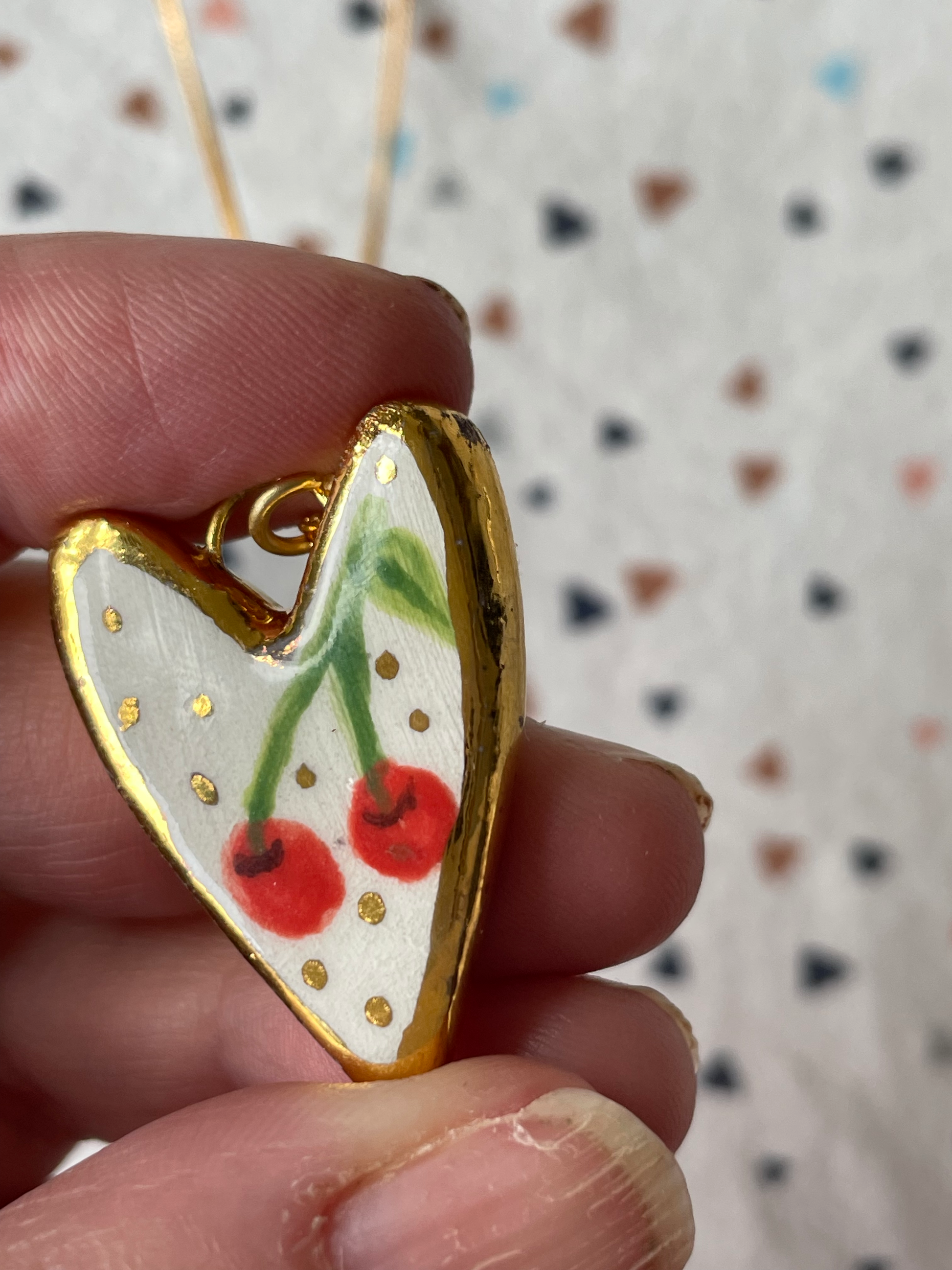 This Heart shaped ceramic charm hand painted with a Cherry design has a vintage look and feel about it. Hand painted on the front only, in a rich red, green with the addition of hand painted gold lustre edge and polka dots that sparkle when the light hit them.