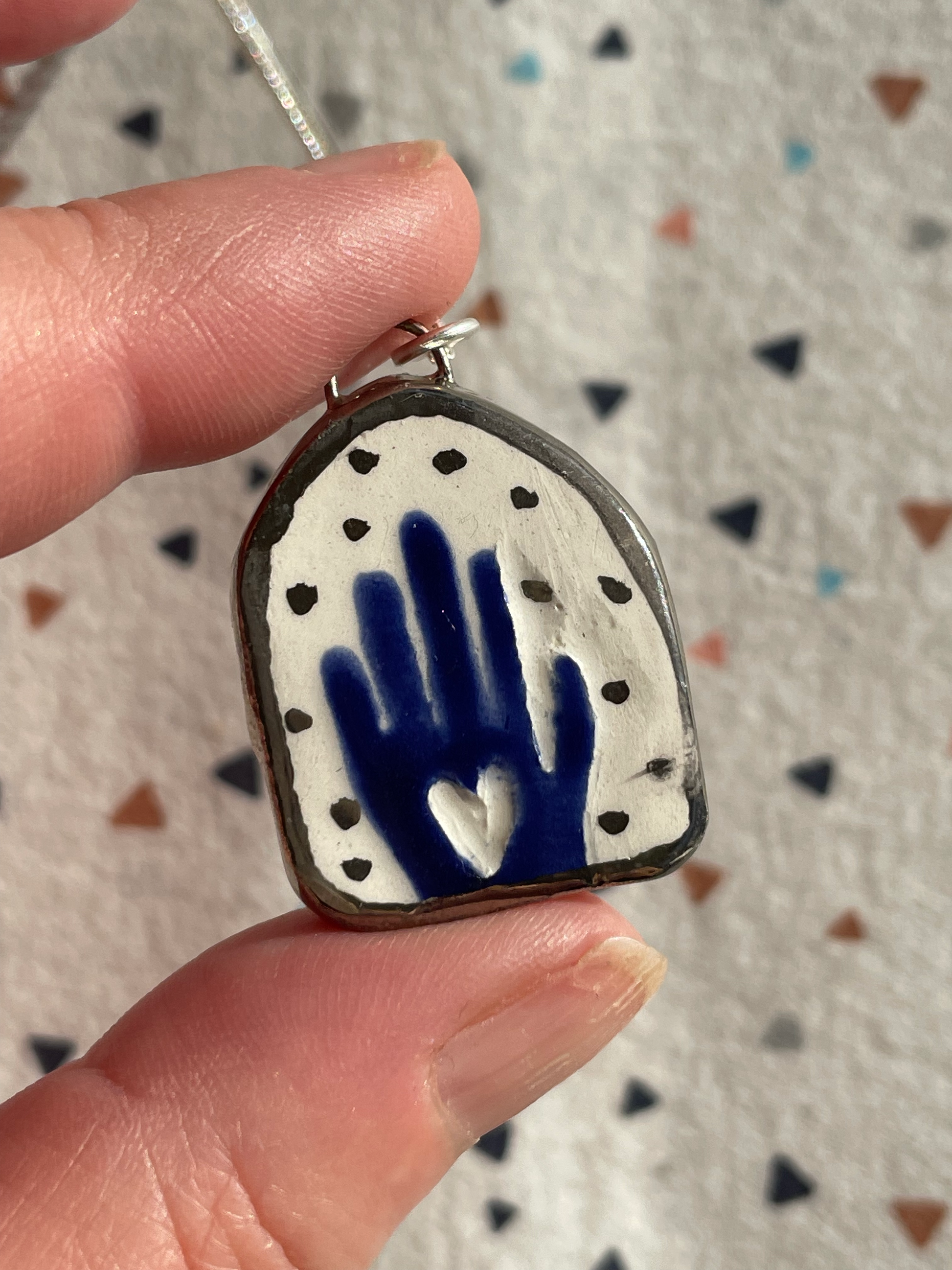 This little ceramic Blue Hand charm with its little hand painted Silver Lustre Polka Dots and the Silver lustre edge . Hand painted on the front only.
