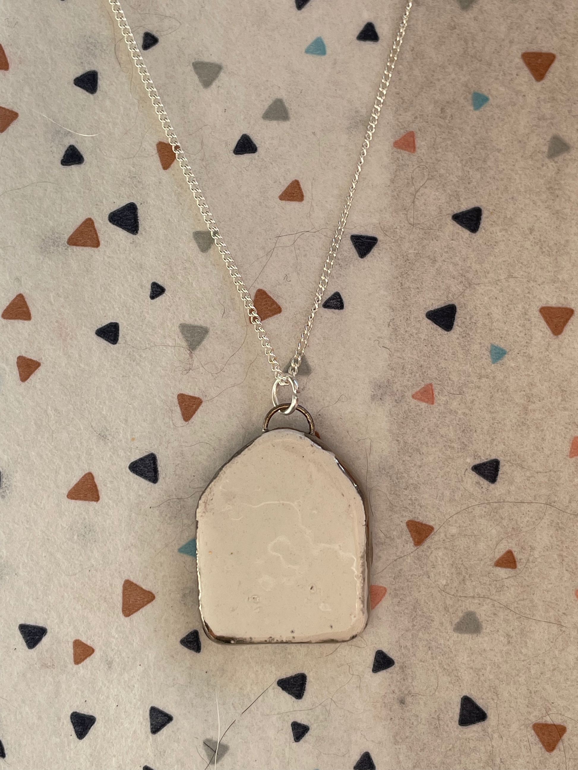 How has this charm been made? - This item has been handmade and hand painted. It has been made from clay, dried, fired for a first time, hand painted, glazed, fired for a second time, Silver lustre has been hand painted on, fired for a third time, jump ring added and threaded onto an 18"/45cm Silver Plated Chain.
