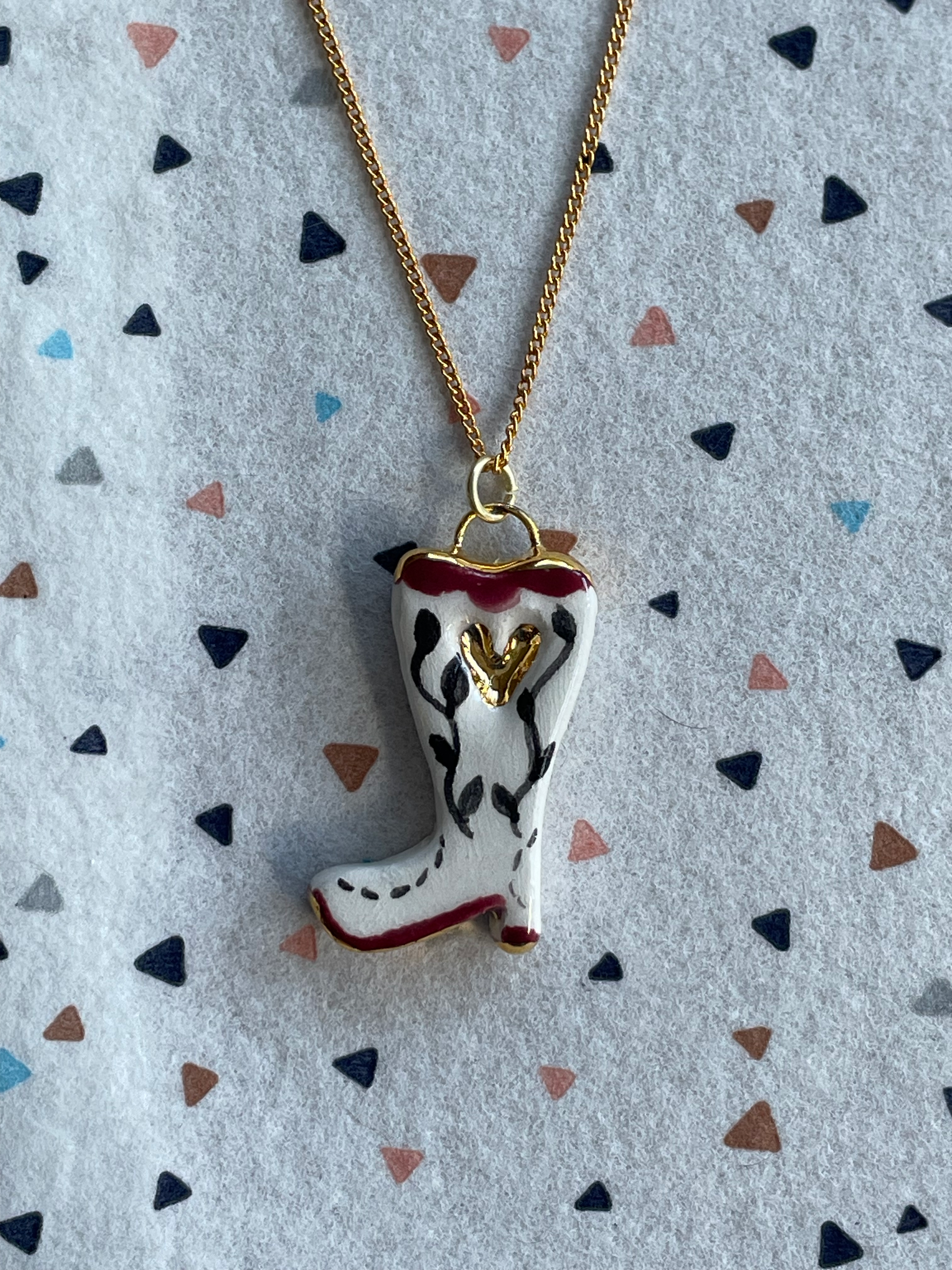 Seconds - Handmade White Cowboy Boot Ceramic Charm Necklace on a 18"/45cm Gold Plated Chain