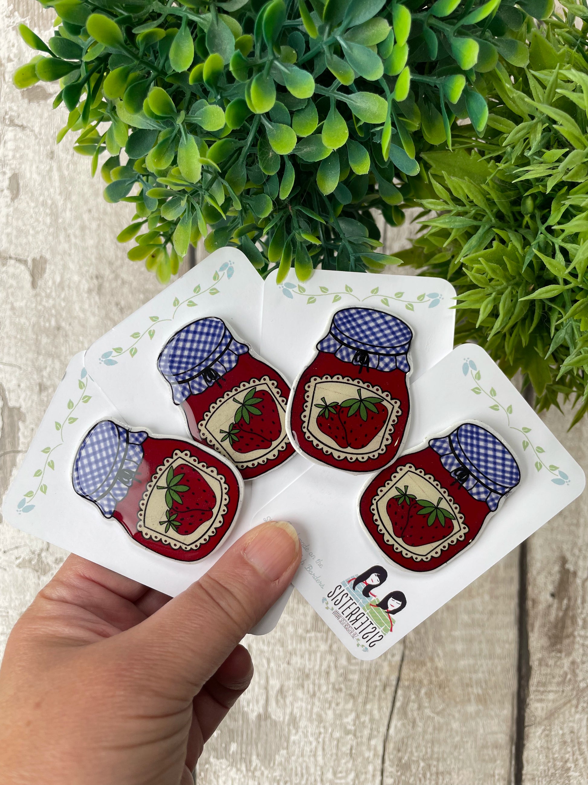 Seconds sale! Strawberry jam jar pin badge with tiny print smudges/lines. Cute foodie accessory for jackets & bags. Choose your numbered badge (1–4).