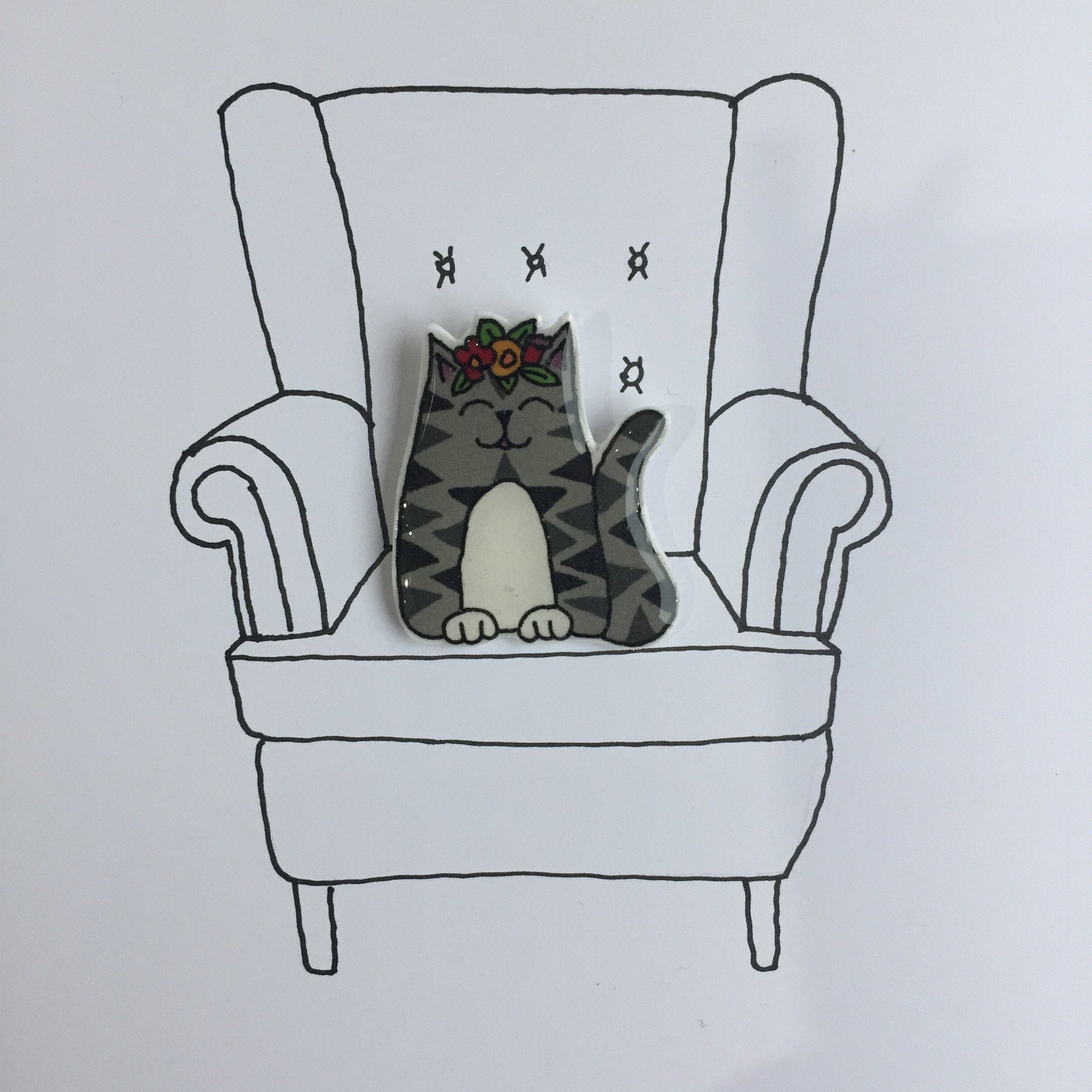 This Silver Tabby Cat is wearing a crown of flowers and will sit pretty on any coat or bag