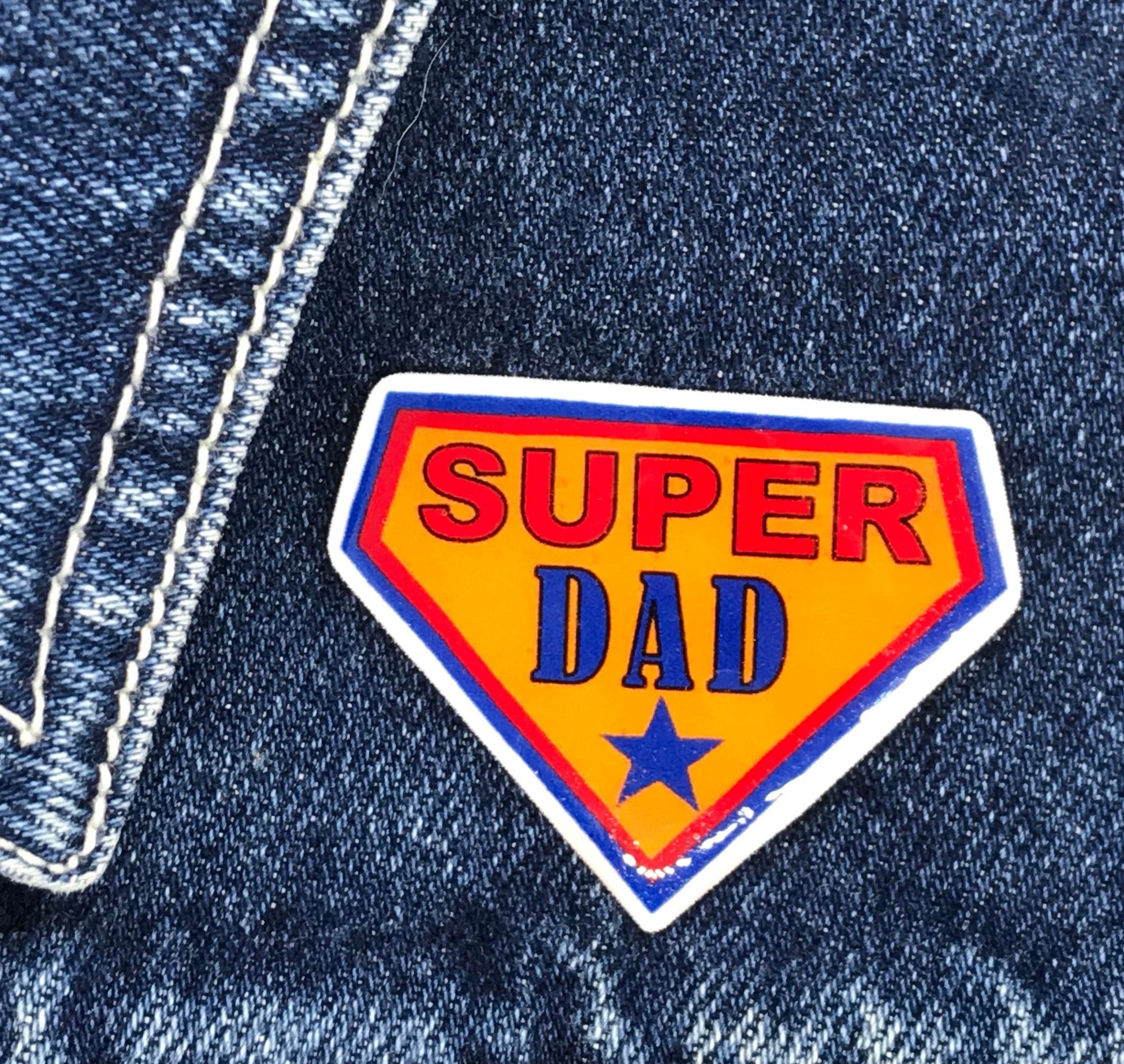 his pin has been designed using the classic Superhero colours of Red, Blue and Orange and the word Super is written in Red and the word Dad is written in Blue.