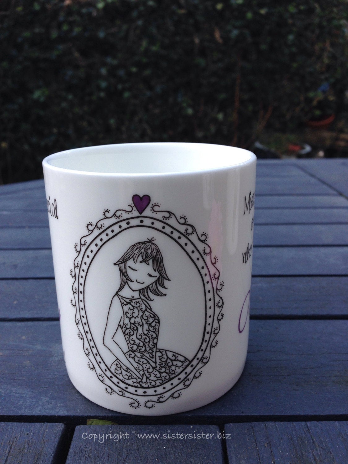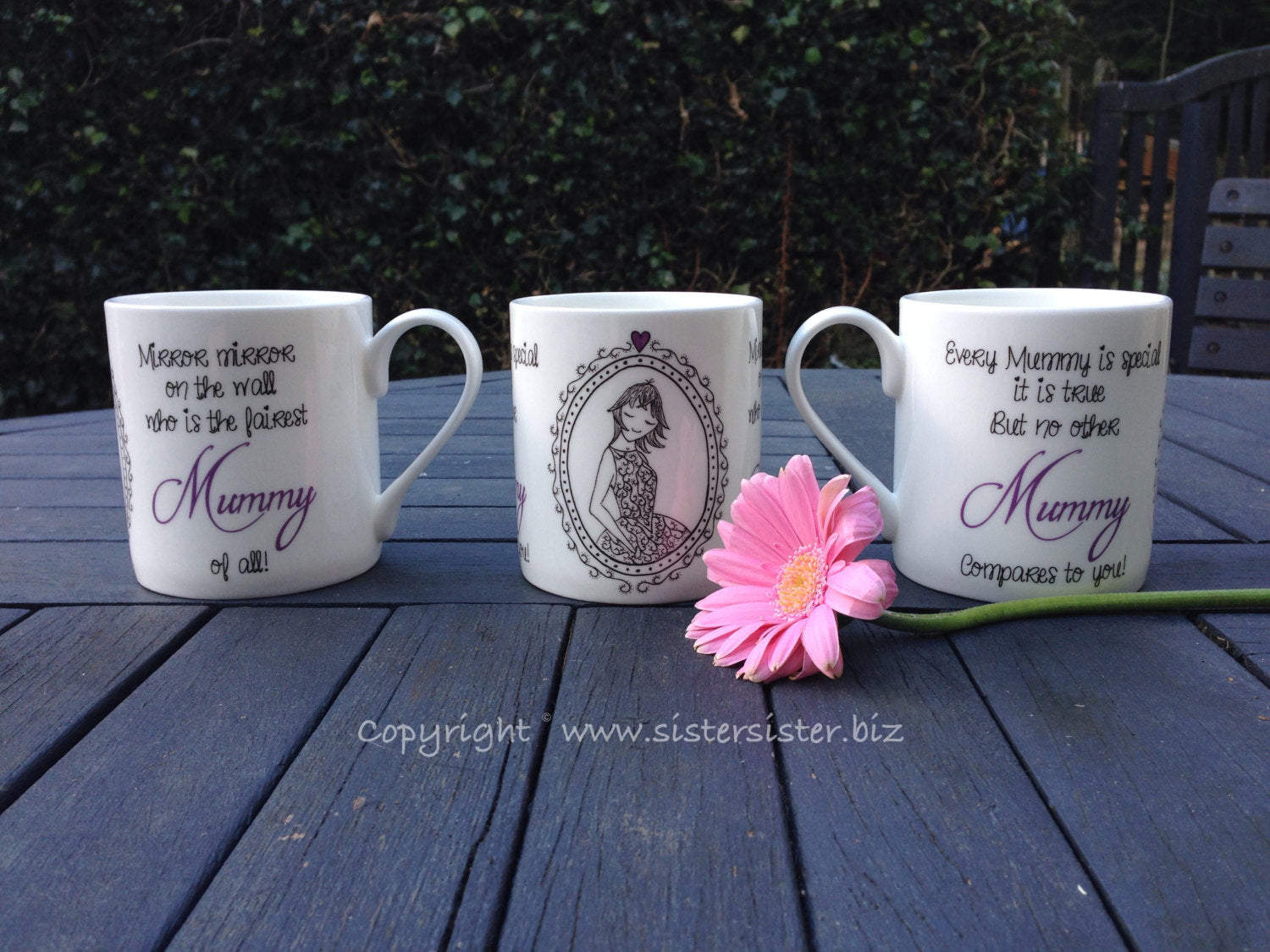 The front of the mug depicts the start of the Mirror Mirror poem with "Mirror mirror on the wall, who is the fairest Mummy of all". The back of the mug is the completion of the poem written by Sarah "Every mummy is special, it is true. But no other Mummy can compare to you". In the centre of the mug is one of Sarah's pretty drawings of a mum in the mirror. Flashes of a pinky purple colour