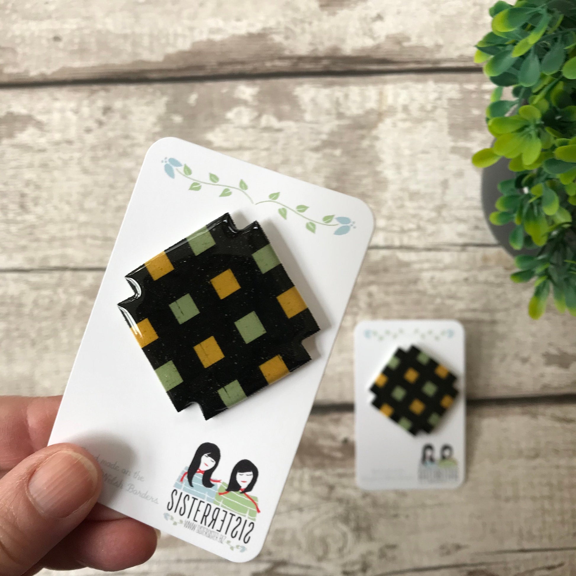 The Welsh Tapestry design is synonymous with Wales and I wanted to create my own design based on a piece of the Tapestry design, so this pin is a nod to this iconic part of Welsh Design and is intended as a fashion piece in Black, Mustard and a grey/green.